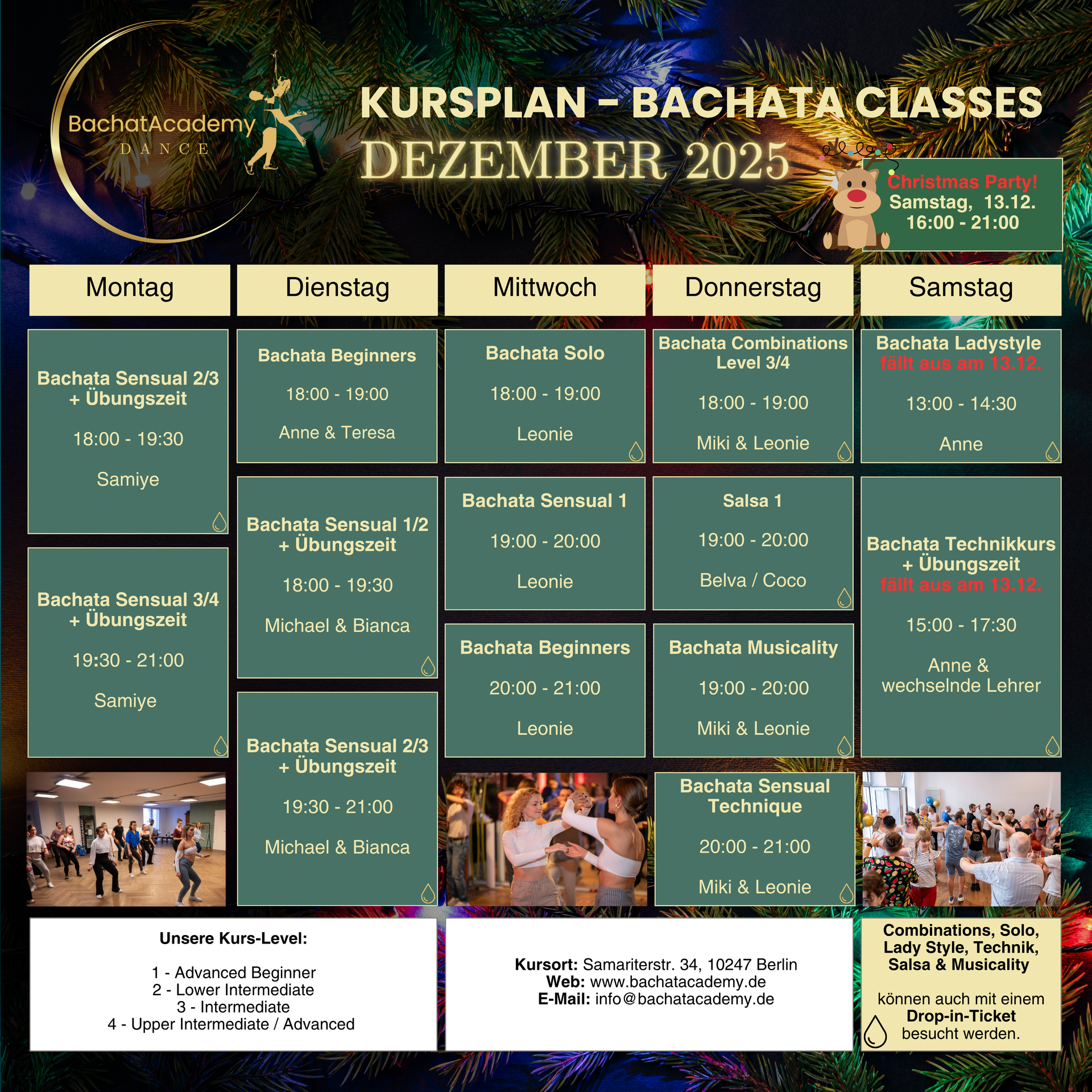 Für alle, die noch mehr wollen, bieten wir zusätzliche Kurse wie Sensual Combinations, Bachata Sensual Technique + Übungszeit, Ladystyle oder Musicality (nicht für Beginner).